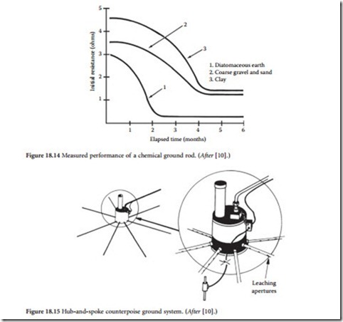 Another approach is shown in Figure 18.13. This device incorporates a number of ports (holes) in the assembly. Moisture from the soil (and rain) is absorbed through the ports. The metallic salts subsequently absorb the moisture, forming a saturated solution that seeps out of the ports and into the earth- to-electrode hemisphere. Tests have shown that if the moisture content is within the required range, earth resistivity can be reduced by as much as 100:1. Figure 18.14 shows the measured performance of a typical chemical ground rod in three types of soil.