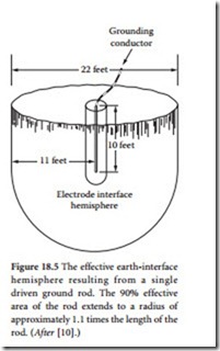 The grounding electrode (or ground rod) interacts with the earth to create a hemisphere-shaped volume, as illustrated in Figure 18.5. The size of this volume is related to the size of the grounding electrode. The length of the electrode has a much greater effect than the diameter. Studies have demonstrated that the earth-to-electrode resistance from a driven ground rod increases exponentially with the distance from that rod. At a given point, the change becomes insignificant. It has