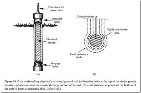 Various approaches have been tried over the years to solve this problem. One such product is shown in Figure 18.12. This chemically activated grounding electrode consists of a 2-1/2-in.-diameter copper pipe filled with rock salt. Breathing holes are provided on the top of the assembly, and seepage holes are located at the bottom. The theory of operation is simple. Moisture is absorbed from the air (when avail- able) and is then absorbed by the salt. This creates a solution that seeps out of the base of the device and conditions the soil in the immediate vicinity of the rod.