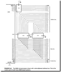 Demultiplexing the 8088. Figure 9–5 illustrates the 8088 microprocessor and the components required to demultiplex its buses. In this case, two 74LS373 or 74LS573 transparent latches are used to demultiplex the address/data bus connections AD7–AD0 and the multiplexed address/ status connections A19/S6–A16/S3.