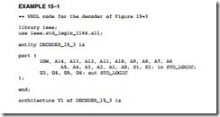 Notice in Example 15–1 how the first term (U3) generates a logic 0 on the output to the decoder only when both switches are in their off positions for I/O port 0300H. It also generates a clock for U3 for I/O ports 304H, 308H, or 30CH, depending on the switch settings. The second term (U4) is active for ports 301H, 305H, 309H, or 30DH, depending on the switch settings. Again, refer to Table 15–2 for the complete set of port assignments for various switch settings. Since A15 is connected to the bottom of the switches, this circuit will also activate the latches for other I/O locations, because it is not decoded. I/O addresses 830XH will also generate clock sig- nals to the latch because A15 is not decoded.