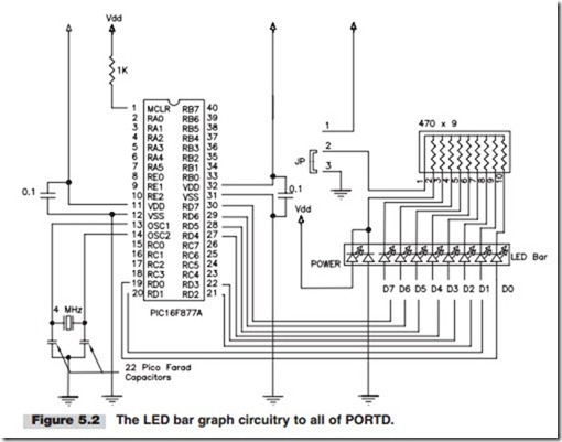 In the next experiment (Program 5.2), the circuitry for which is shown in Figure 5.2, we will blink the eight rightmost LEDs on the bar graph one LED at a time. We do this by setting PORTD to 1 and then multiplying it by two eight times to move the lighted LED left in each iteration. Note that the last multiplication overflows the 8-bit counter and turns all the LEDs off.