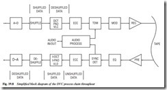 Fig. 19.8 outlines the DVC record and replay processes. After A−D conversion the data is shuffled by taking macroblock samples from widely spaced areas of the picture and assembling them into a seemingly random order for the DCT and variable-length coding processes. Here the bit-rate of five macroblocks is reduced from about 15 kbit to 3 kbit, after which the data is deshuffled once more to restore correct order (left-to-right and top-to-bottom scanning) for recording on tape: the top of the picture is recorded first, and the picture bottom at the run-off (top of tape) of the last of the 12 head scans per frame. Picture LHS data is written to tape at the entry side of head scan, and picture RHS data at the exit side. The reason for the shuffle/deshuffle process (which has to be repeated in playback)